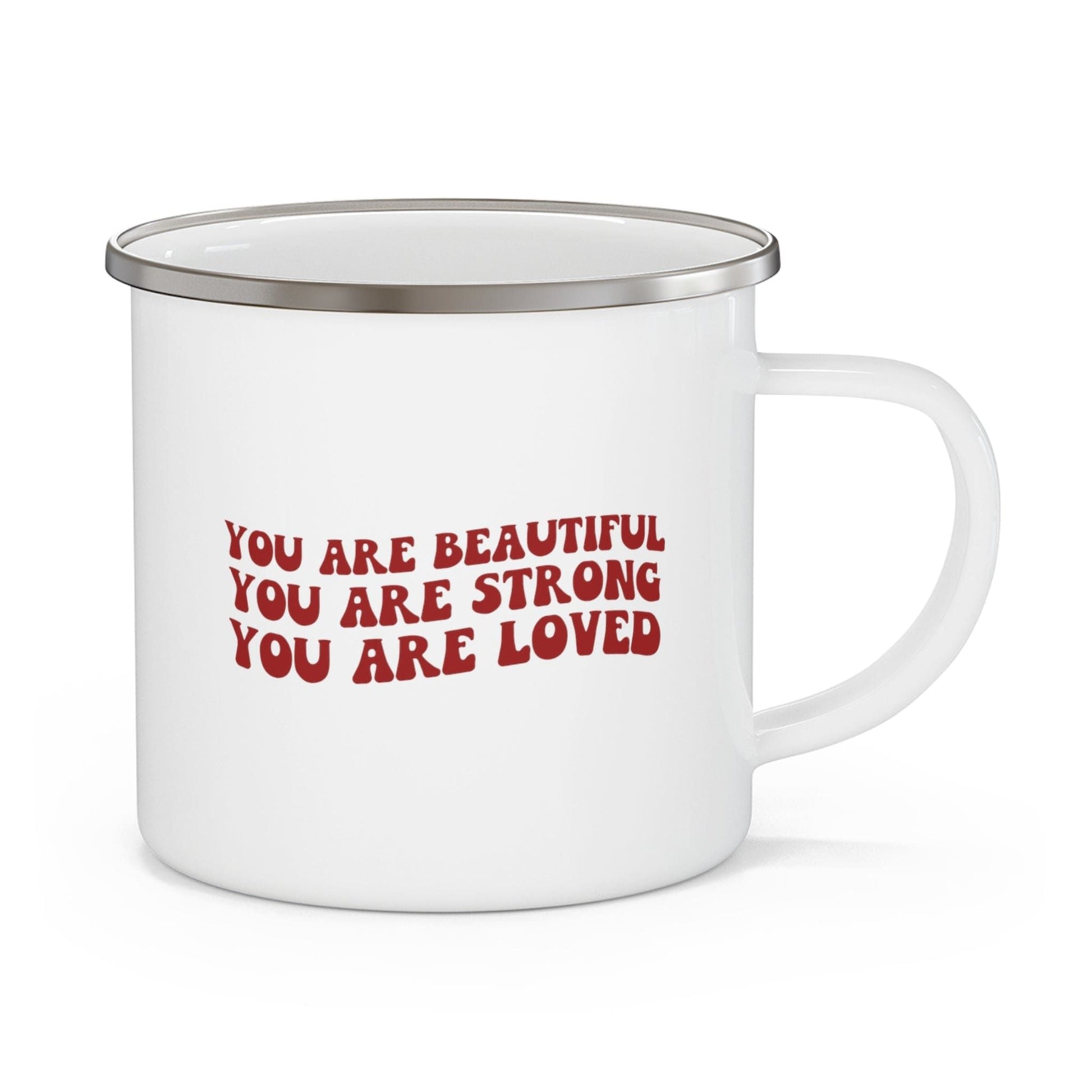 Enamel Camping Mug, You Are Beautiful Strong Loved Inspiration Affirmation Red