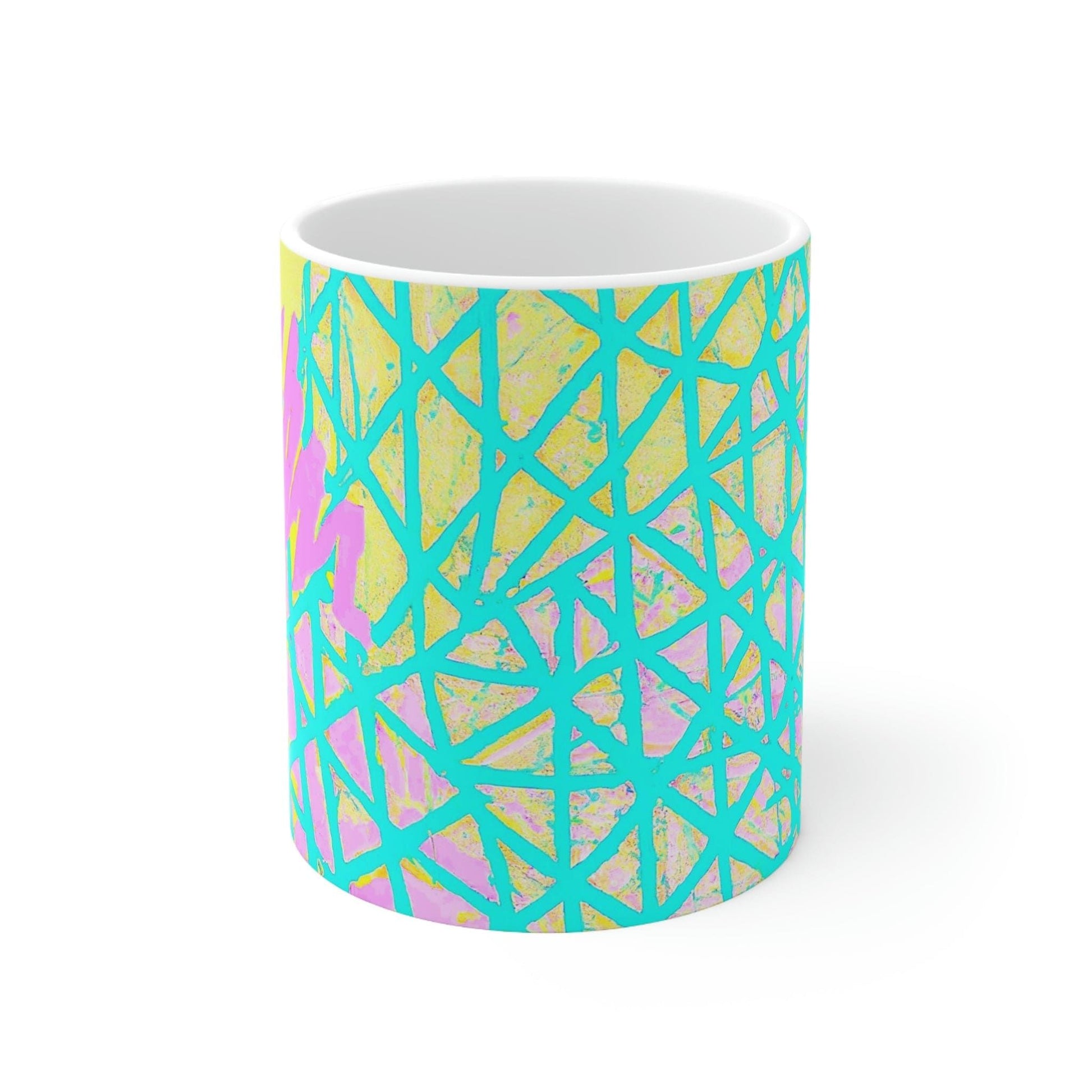 Cyan Blue Lime Green And Pink Pattern. Warm-up with a nice cuppa out of this customized ceramic coffee mug. Personalize it with cool designs, photos or logos to make that "aaahhh!" moment even better. It's BPA and Lead-free, microwave & dishwasher-safe, and made of white, durable ceramic in 11-ounce size. Thanks to the advanced printing tech, your designs come to life with incredibly vivid colors – the perfect gift for coffee, tea, and chocolate lovers.